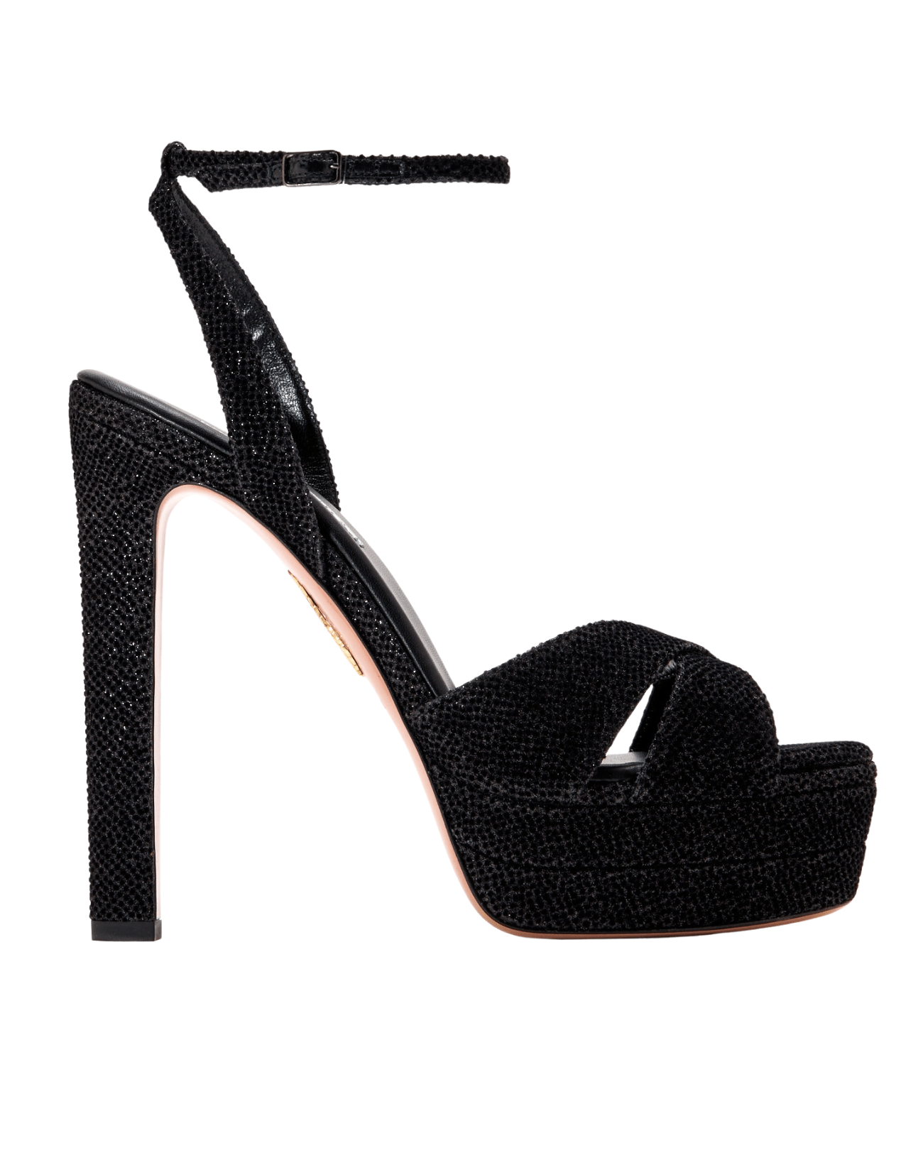 The Divine Plateau 130 Heeled Sandals are crafted in soft black velvet and studded with crystals, boasting a dramatic 130 mm block heel and a raised platform that balances height with comfort.